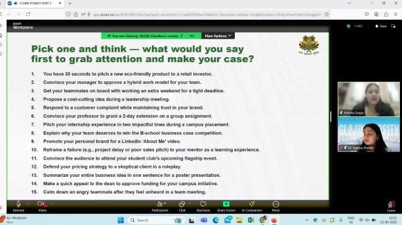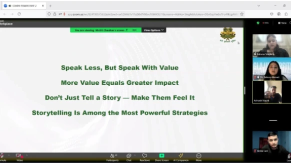 Ms. Ashima Singla, Team Lead – Soft Skills Trainer, GLA Online University, Mathura Description: This session aimed to equip students with advanced communication strategies, emphasizing the strategic use of language to influence, persuade, and build meaningful connections.